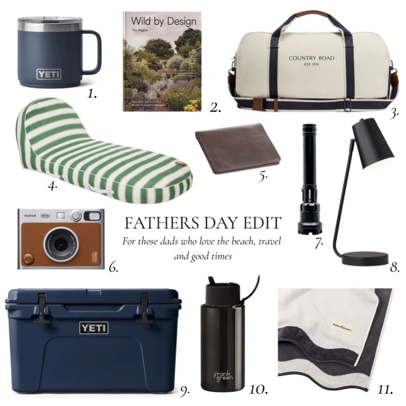 1. Rambler 14oz Stackable Mug, $45.00, Yeti. 2. Wild by Design Book, $59.00, Tim Pilgrim 3. Country Road Logo Tote, $129.00, Country Road. 4. The Pool Lounger, $319.00, Business and Pleasure Co. 5. Lars Wallet, $29.95, Frankie Say Relax. 6. INSTAX mini Evo Hybrid Camera, $299.00, Officeworks. 7. Hi Beam HD Torch, $119.99, Hi Beam. 8. Arlen Desk Lamp, $249.00, Socialight. 9. Tundra 45 Hard Cooler, $450.00, Yeti. 10. Shadow Chrome Ceramic Bottle, $79.95, . 11. The Beach Towel, $99.00, Business and Pleasure Co.